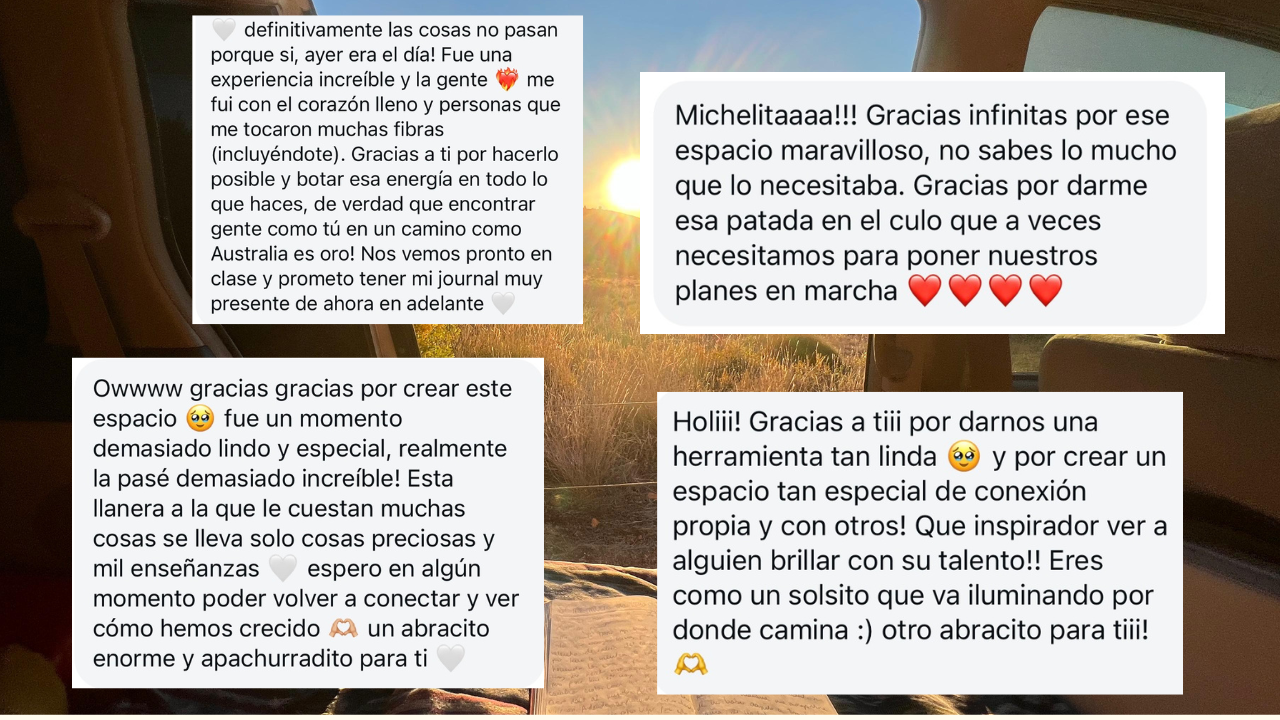 Este es un espacio para entablar una conversación de corazón a corazón con las diferentes versiones de nuestra historia. La versión de nosotros que llegó acá, la que estamos construyendo y finalmente la que soñamos con alcanzar! Podremos plasmar en el papel experiencias, aprendizajes, miedos e ilusiones y lo mejor de todo, conectaremos con otras historias humanas, migrantes también, que nos inspirarán y nos darán perspectiva. La intención principal de esta experiencia es activar tu inspiración, que conectes con la comunidad pero sobretodo que conectes con la verdad de tu corazón ⚡️